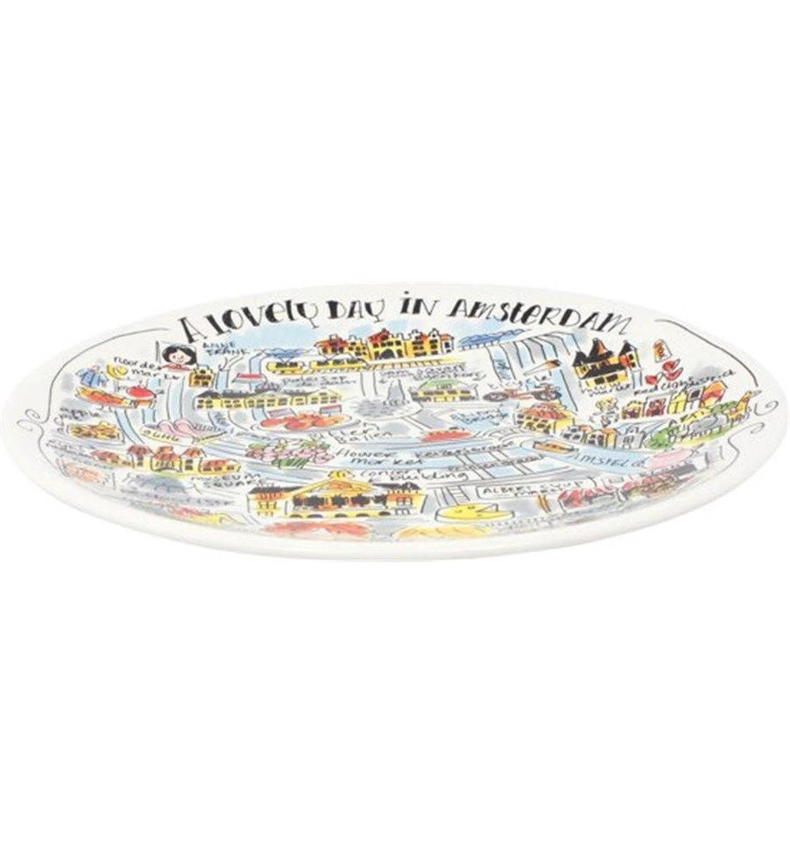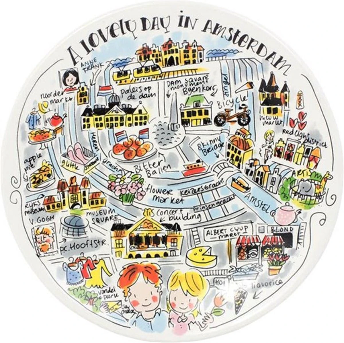 Amsterdam! Paleis op de Dam, de bloemenmarkt, grachten en alle andere highlights uit deze mooie stad staan afgebeeld op dit vrolijke, kleurrijke Blond Amsterdam ontbijtbord.