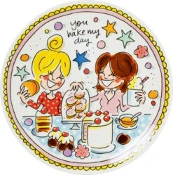 De collectie Even Bijkletsen is nog steeds de grote favoriet van vele Blond-liefhebbers. De nieuwe items zijn leuk om met elkaar te combineren, maar passen ook heel goed bij onze huidige Even Bijkletsen items. Op dit taartbord staan onze herkenbare, vrolijke illustraties en deze heeft een roze rand. Op het bordje staat de tekst: ” You Bake my Day” Eet smakelijk!