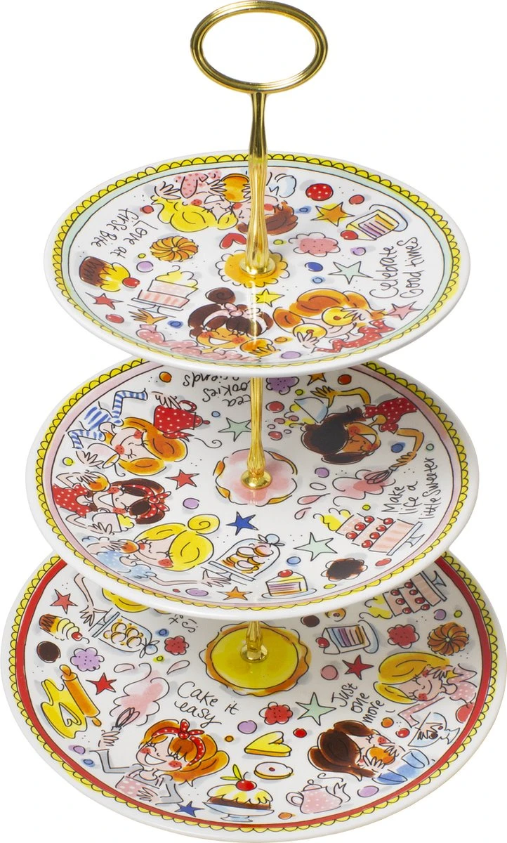 De collectie Even Bijkletsen is nog steeds de grote favoriet van vele Blond-liefhebbers. Deze collectie is daarom uitgebreid met een nieuwe etagère Tea & Cookies. De etagère is ideaal geschikt voor het serveren van de lekkerste hapjes en staat ook nog eens erg leuk op tafel. Voorzien van 3 lagen met 3 vrolijke borden in de stijl van Even Bijkletsen. De borden hebben verschillende gekleurde randen. Het bovenste bord mint, het middelste bord roze en het onderste bord een rode rand. Op de etagère staan de herkenbare, vrolijke illustraties met teksten zoals ‘Life is sweet’ en ‘You bake my day’ .De etagère heeft een vrolijke verpakking en is ook erg leuk om cadeau te doen!