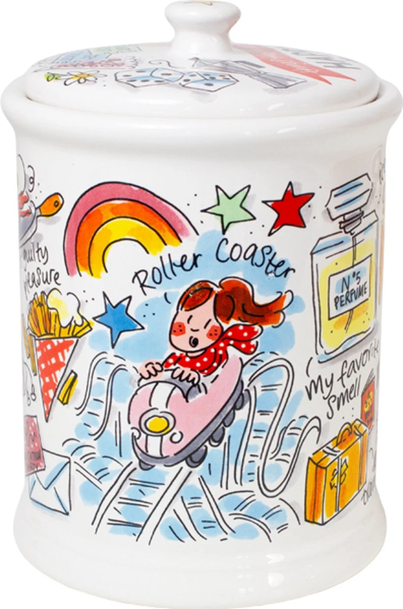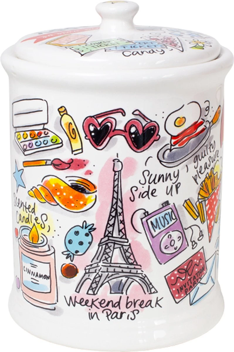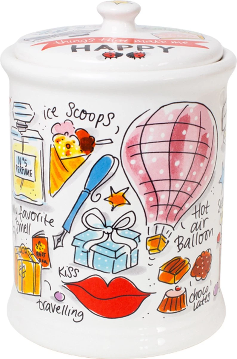 This make me happy! Deze vrolijke voorraadpot, maakt jouw tafel nog gezelliger! De opvallende en kleurrijke illustraties zijn in het thema Happy ontworpen. Op de voorraadpot staan allemaal grappige quotes die jou blij maken. De voorraadpot is leuk te combineren met de andere nieuwe Happy items. Deze voorraadpot heeft aan de binnenkant een ruberen ring waardoor deze goed afsluit en handig is om eten in te bewaren.