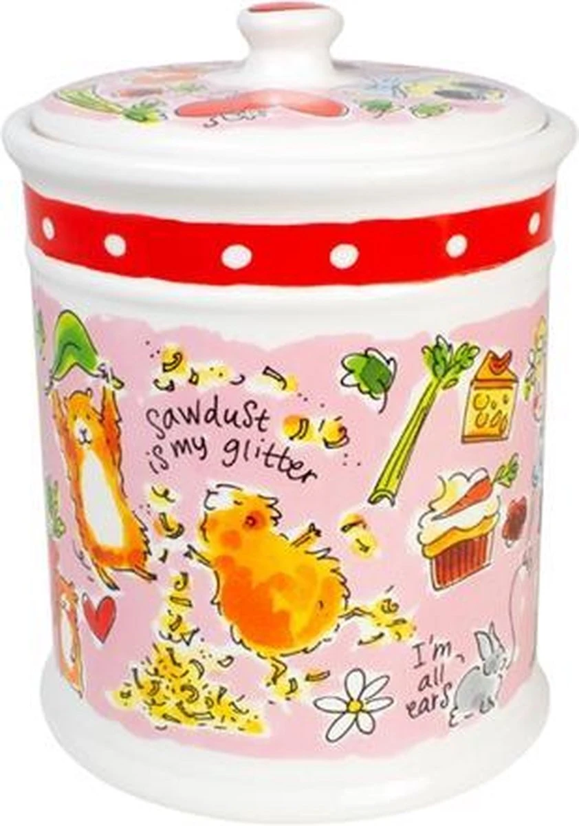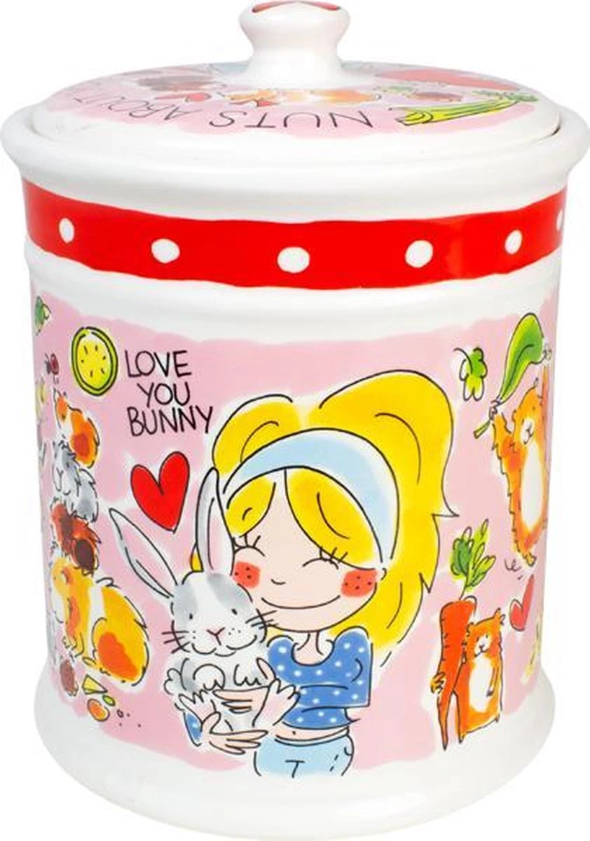 De Blond Amsterdam Voorraadpot Konijn van 16 x 16 x 22,5 cm is een aardewerken pot in Blond-stijl om de brokjes of snoepjes van jouw dier in op te bergen. Deze leuke voorraadpot vrolijkt gelijk de hele ruimte op! De aardewerken pot is uitgevoerd in de bekende Blond Amsterdam-stijl, met een vrolijke opdruk van diverse konijnen, hamsters en cavia’s en leuke tekstjes. De voorraadpot is wit met een roze achtergrond en rode band. Ook op het deksel is een leuke opdruk geplaatst. De voorraadpot is magnetron- en vaatwasserbestendig en mag niet ontbreken in elk dierenhuishouden!
