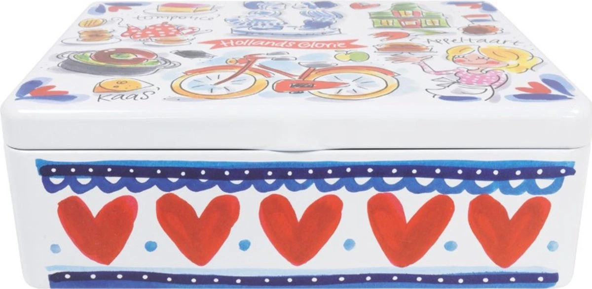 Rechthoekig theeblik met kleurrijke schildering van typisch Nederlandse dingen. Het theeblik heeft een vaste deksel en is luchtdicht. Het theeblik is verdeeld in 6 vakken, voor je favoriete smaken.